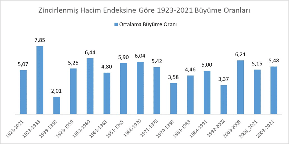 Bu tablodan hareketle Türkiye Cumhuriyeti’nin yıllık ortalama büyüme oranının yüzde 5 olduğu söylenebilir. En az büyüme trendi 2. Dünya Savaşı’nın yıllarında olmuştur. En çok büyüme trendi ise Cumhuriyet’in kurulduğu ilk dönemde yakalanmıştır.