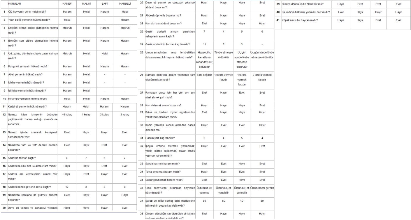 Ayrıca mezheplerin içinde de farklı helal haram inanışları vardır. Bir mezhebin helal saydığını başka bir mezhep haram saymış aralarında ihtilaflar kavgalar atışmalar olmuş hatta bunlar savaşlara bile sebep olmuştur. Aşağıda verilen çizelgede aradaki büyük farklılaşma net bir şekilde görülüyor.